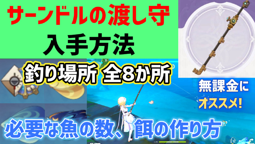 釣り武器「サーンドルの渡し守」の交換・完凸に必要な魚が取れる釣り場「全14か所」のマップと、魚・餌の必要数の表です。