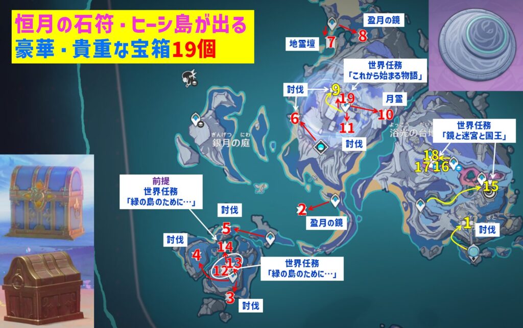 恒月の石符・ヒーシ島が出る豪華・貴重な宝箱「19個」のマップ