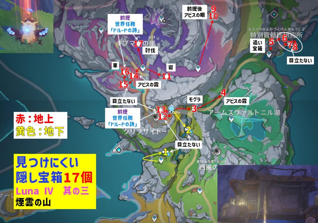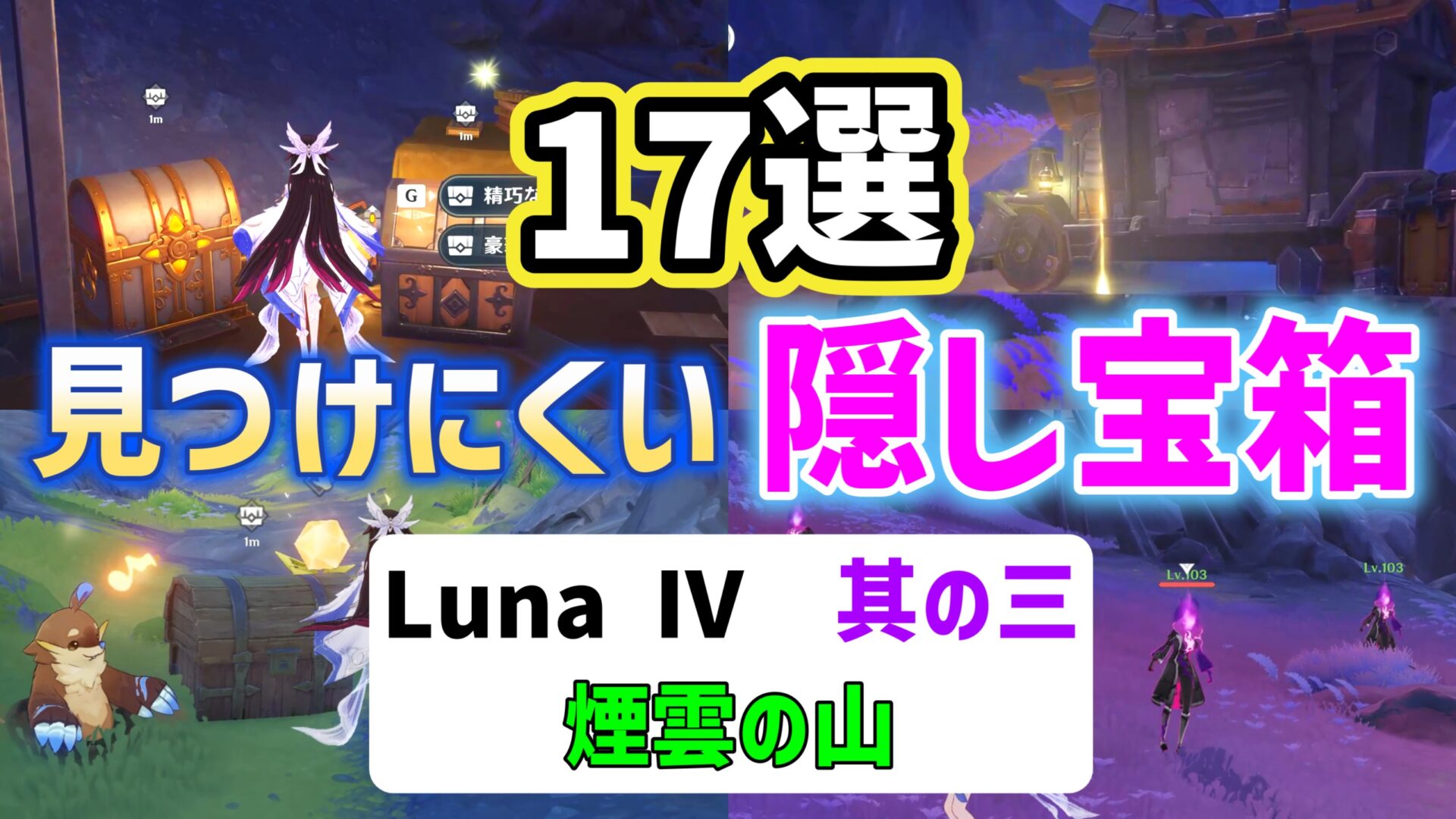 Luna Ⅳ「煙雲の山」エリアにある、見つけにくい隠し宝箱を「17個」選んで紹介しています。