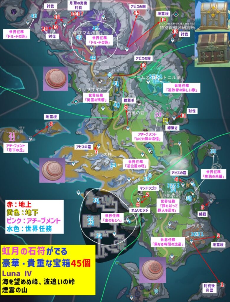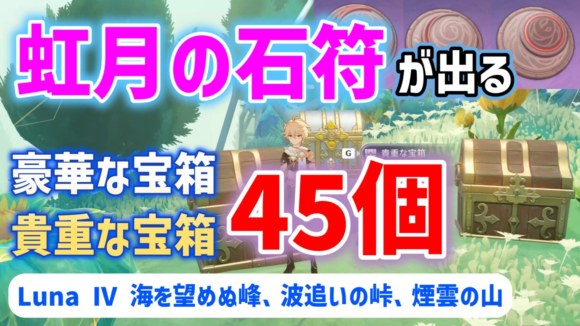 虹月の石符が出る豪華な宝箱・貴重な宝箱「全45個」 海を望めぬ峰、波追いの峠、煙雲の山 聖啓の塵 月の宝庫 地霊壇の場所 ナド・クライ Luna Ⅳ 原神 攻略
