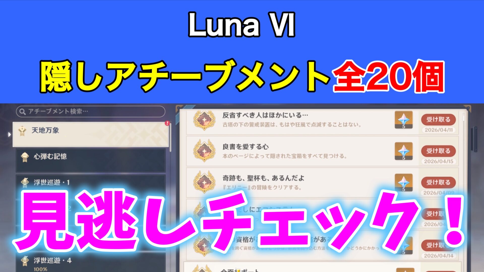 Luna Ⅵの隠しアチーブメント「全20個」です。